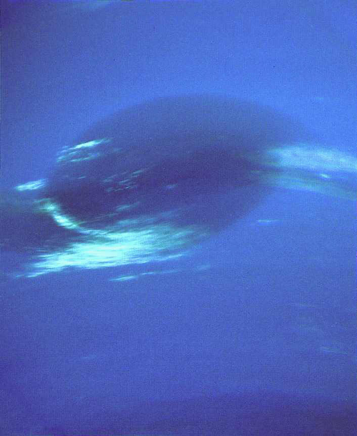 والغلاف الجوي لنبتون يظهر خطوط نمطية من الغيوم. هذه